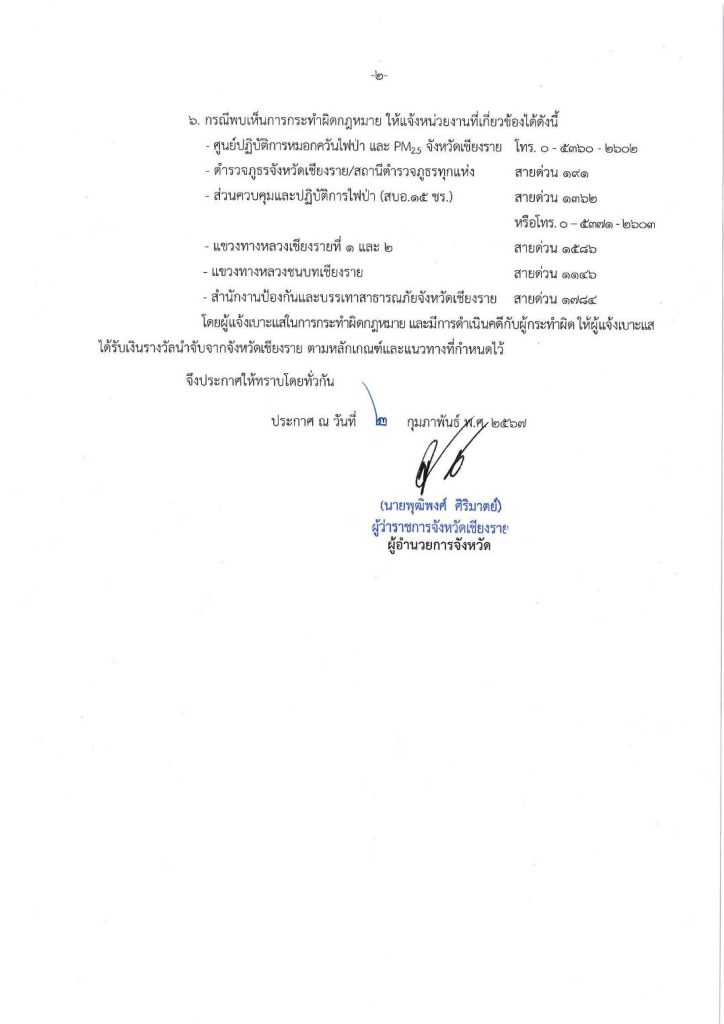 ประกาศกองอำนวยการป้องกันและบรรเทาสาธารณภัย จังหวัดเชียงราย เรื่อง ห้ามการเผาในที่โล่งทุกชนิดโดยเด็ดขาด ห้วง “76 วันปลอดการเผา โดยเด็ดขาด ตั้งแต่วันที่ 15 ก.พ. – 30 เม.ย.67” ฝ่าฝืนต้องระวางโทษจำคุม ตั้งแต่ 3 เดือน – 1 ปี ปรับ 25,000 – 3,000,000 บาท