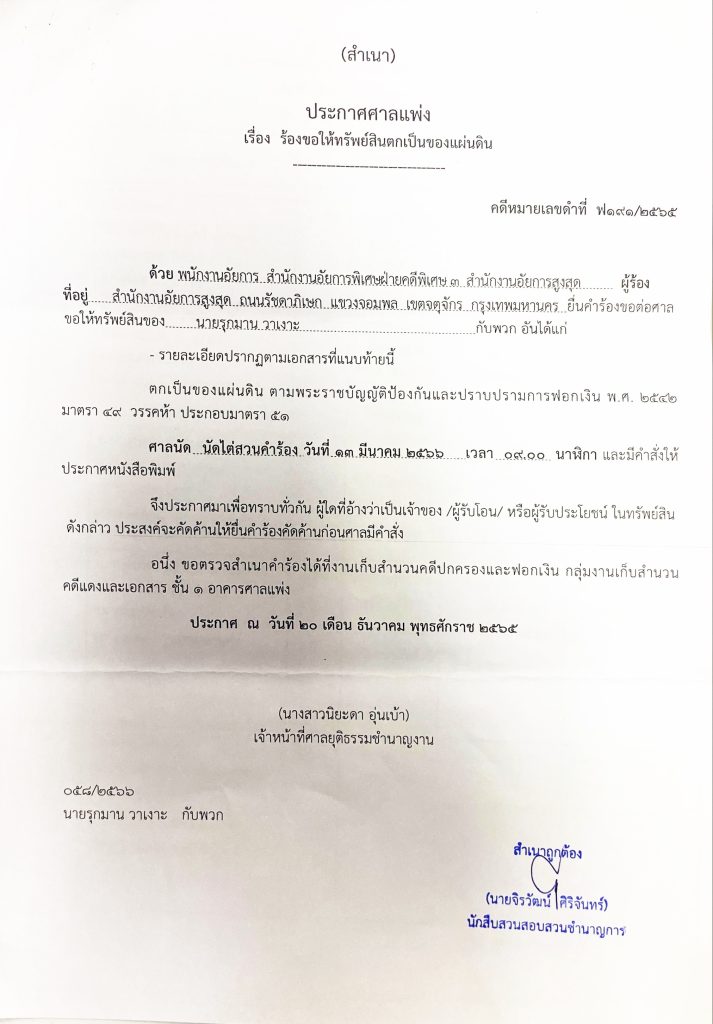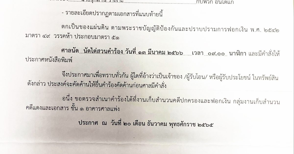 ประกาศศาลเพ่ง 19 มกราคม 2566 โดย admin / ข่าวประชาสัมพันธ์,ข่าวประชาสัมพันธ์,ข่าวฝากประชาสัมพันธ์ เรื่อง ร้องขอให้ทรัพย์สินตกเป็นของแผ่นดิน FacebookFacebookXXLINELine