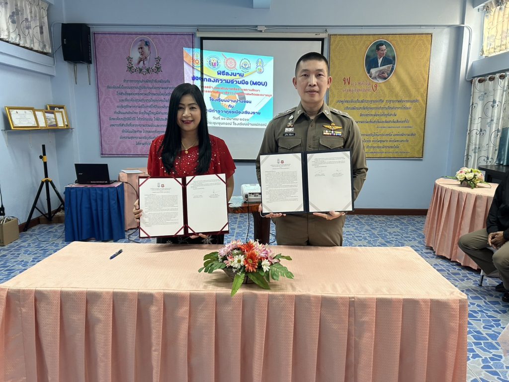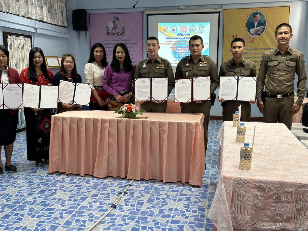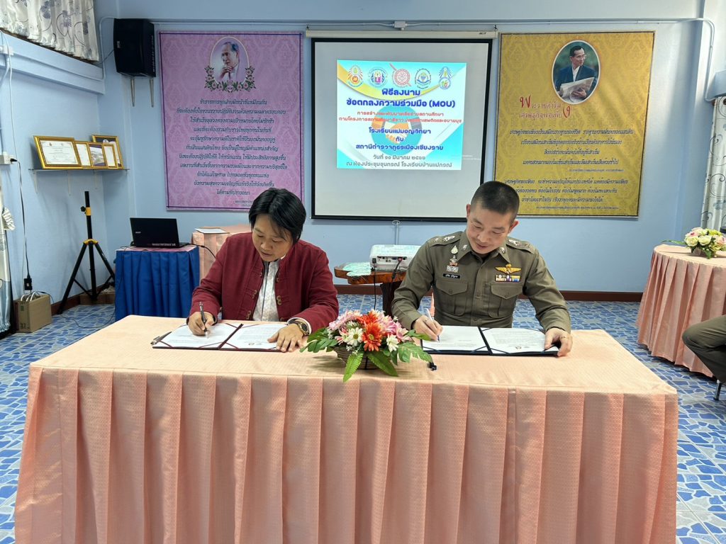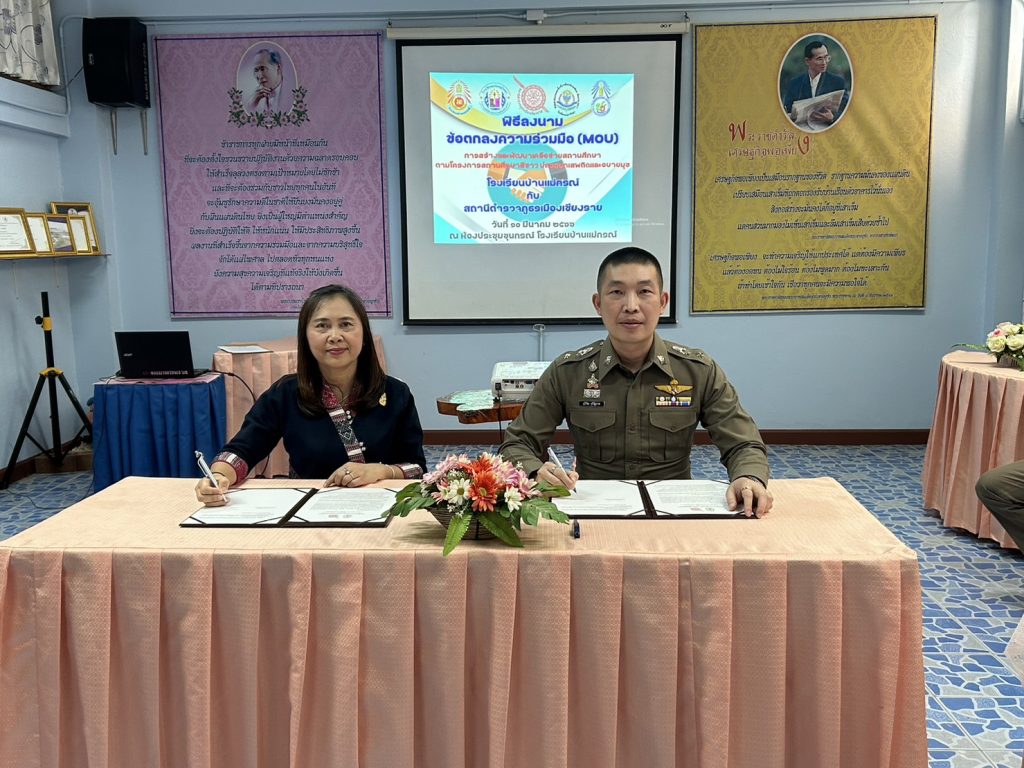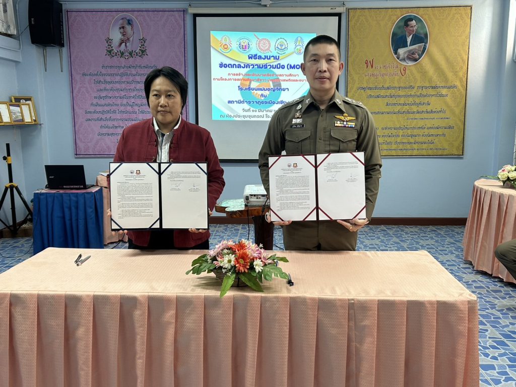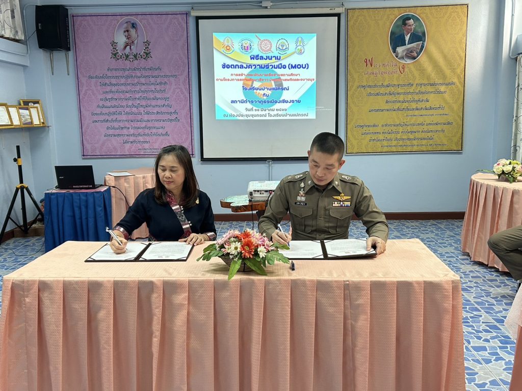 วันที่ 10 มีนาคม 2566 เวลา 13.30 น.โดยการอำนวยการ พ.ต.อ.โสภณ ม่วงเฟื่อง ผกก.สภ.เมืองเชียงราย มอบหมายให้ พ.ต.ท.ภูริวัฒ รุจิรัฐภาส รอง ผกก.ปฯ , พ.ต.ท.เอกพล ยาสิทธิ์ สวป.ฯ และชุด ชมส. ร่วมพิธีลงนามข้อตกลงความร่วมมือ (MOU) การสร้างและพัฒนาเครือข่ายสถานศึกษาตามโครงการสถานศึกษาสีขาวปลอดยาเสพติดและอบายมุข ระหว่าง สภ.เมืองเชียงราย กับ รร.บ้านแม่กรณ์ , รร.แม่มอญวิทยา , รร.บ้านปางขอน และ รร.แม่ยาววิทยา ณ ห้องประชุมขุนกรณ์ รร.บ้านแม่กรณ์
