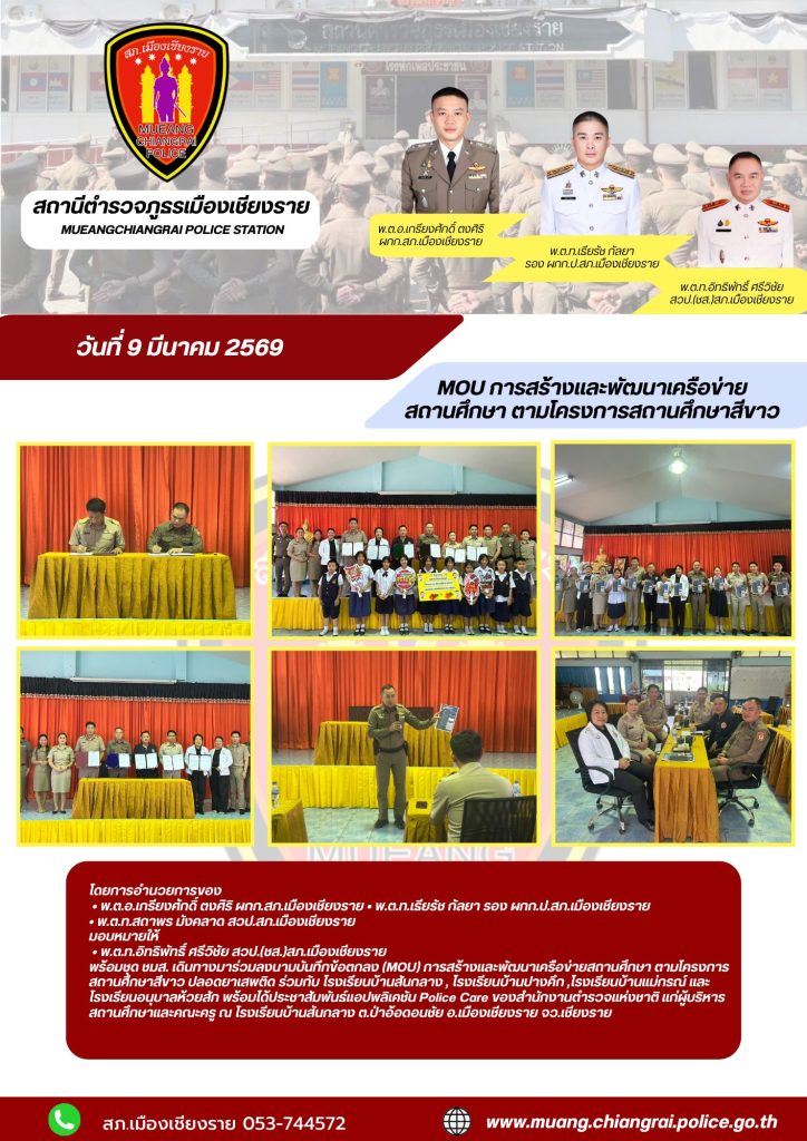วันที่ 9 มี.ค.69 เวลา 09.00 น. พ.ต.ท.อิทธิพัทธิ์ ศรีวิชัย สวป.(ชส.)สภ.เมืองเชียงราย พร้อมชุด ชมส. เดินทางมาร่วมลงนามบันทึกข้อตกลง (MOU) การสร้างและพัฒนาเครือข่ายสถานศึกษา ตามโครงการสถานศึกษาสีขาว ปลอดยาเสพติด ร่วมกับ โรงเรียนบ้านสันกลาง , โรงเรียนบ้านปางคึก ,โรงเรียนบ้านแม่กรณ์ และโรงเรียนอนุบาลห้วยสัก พร้อมได้ประชาสัมพันธ์แอปพลิเคชัน Police Care ของสำนักงานตำรวจแห่งชาติ แก่ผู้บริหารสถานศึกษาและคณะครู ณ โรงเรียนบ้านสันกลาง ต.ป่าอ้อดอนชัย อ.เมืองเชียงราย จว.เชียงราย