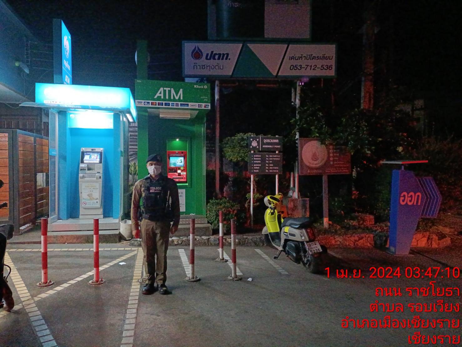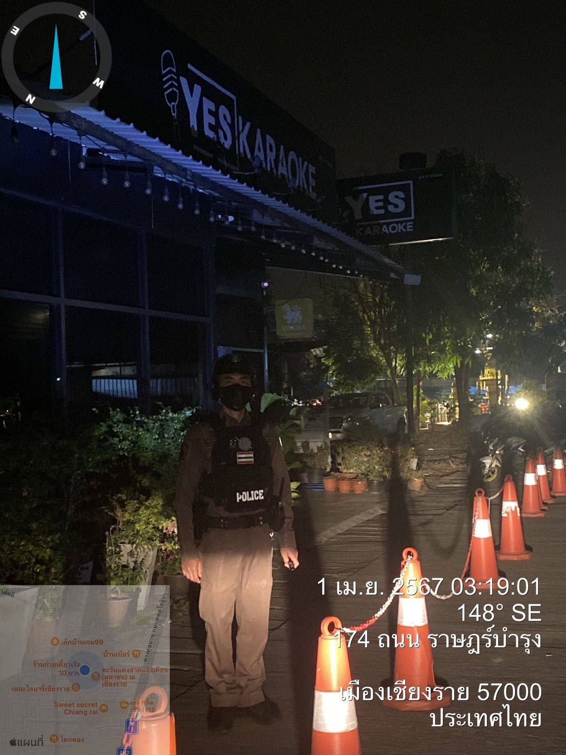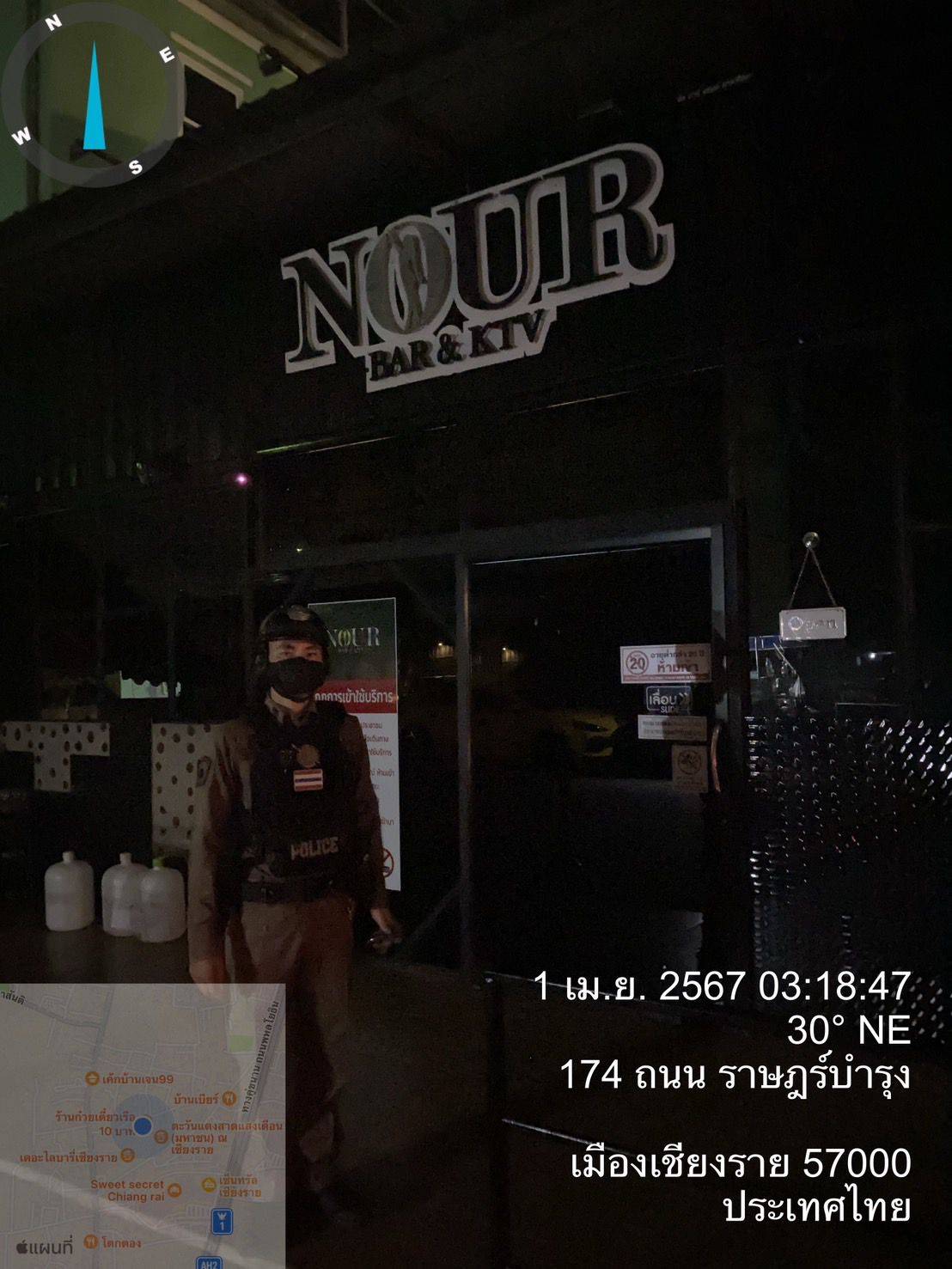 ร้อยเวร20 พร้อมชุดสายตรวจ ออกตรวจสอบการปิดของสถานบริการในพื้นที่ สถานบริการในพื้นที่รับผิดชอบผลการปฏิบัติไม่พบการกระทำผิดกฎหมายแต่อย่างใด และได้กำชับให้ปิดตามเวลาที่กำหนด เหตุการณ์ทั่วไปปกติ 1 เมษายน 2567 โดย admin / ข่าวประชาสัมพันธ์,ข่าวกิจกรรม วันที่ 1 เม.ย. 2567 ภายใต้อำนวยการ พ.ต.อ.โสภณ ม่วงเฟื่อง ผกก.สภ.เมืองเชียงราย โดยให้ พ.ต.ท.ฉันทฤทธิ์ เหล่าไพโรจน์จารี รอง ผกก.ป.สภ.เมืองเชียงราย, พ.ต.ท.สถาพร มังคลาด สวป.สภ.เมืองเชียงราย มอบหมาย ให้ ร.ต.อ.สันชัย ดีจะเสน รอง สวป.ฯ ร้อยเวร20 พร้อมชุดสายตรวจ ออกตรวจสอบการปิดของสถานบริการในพื้นที่ สถานบริการในพื้นที่รับผิดชอบผลการปฏิบัติไม่พบการกระทำผิดกฎหมายแต่อย่างใด และได้กำชับให้ปิดตามเวลาที่กำหนด เหตุการณ์ทั่วไปปกติ FacebookFacebookXXLINELine