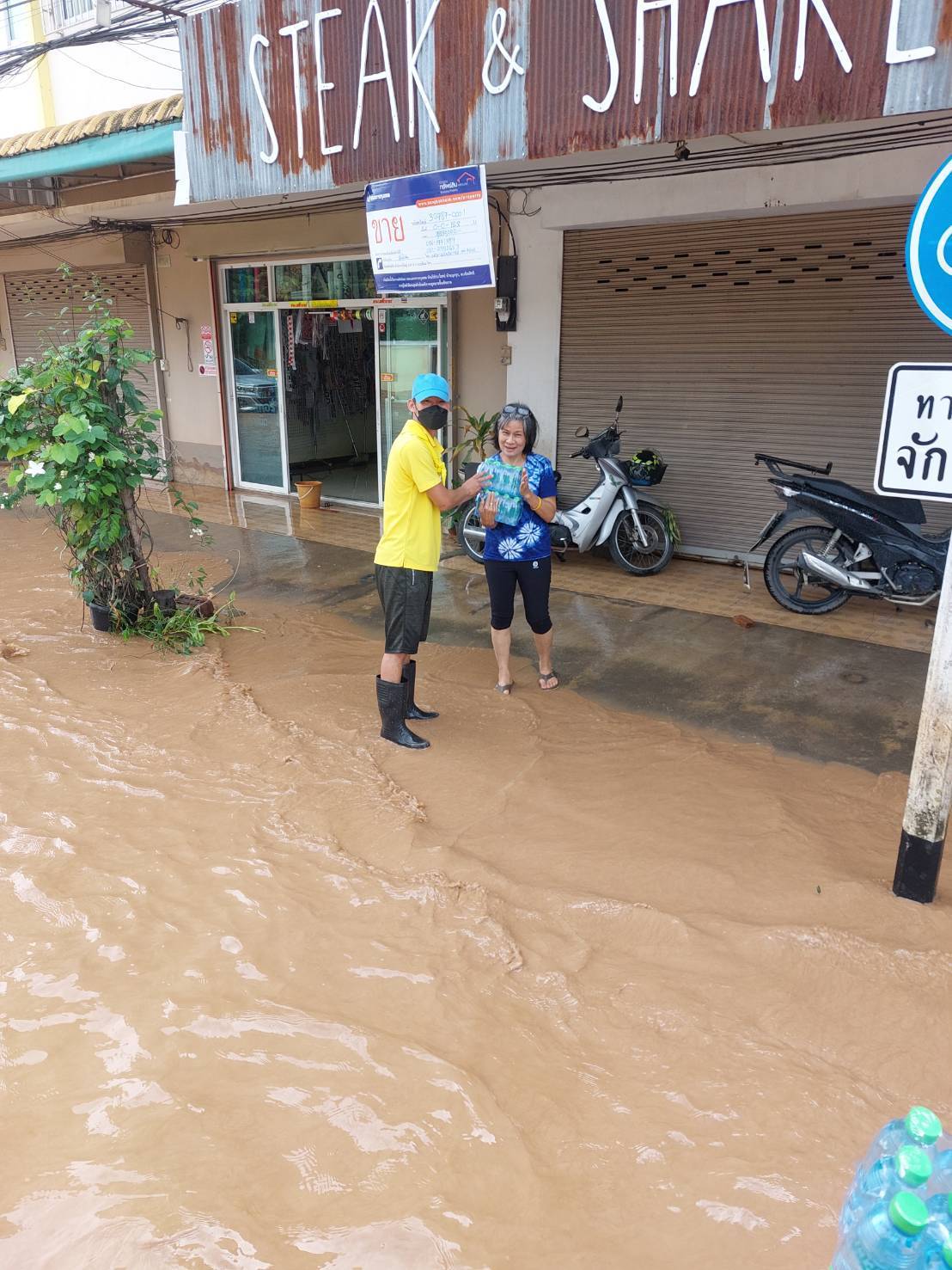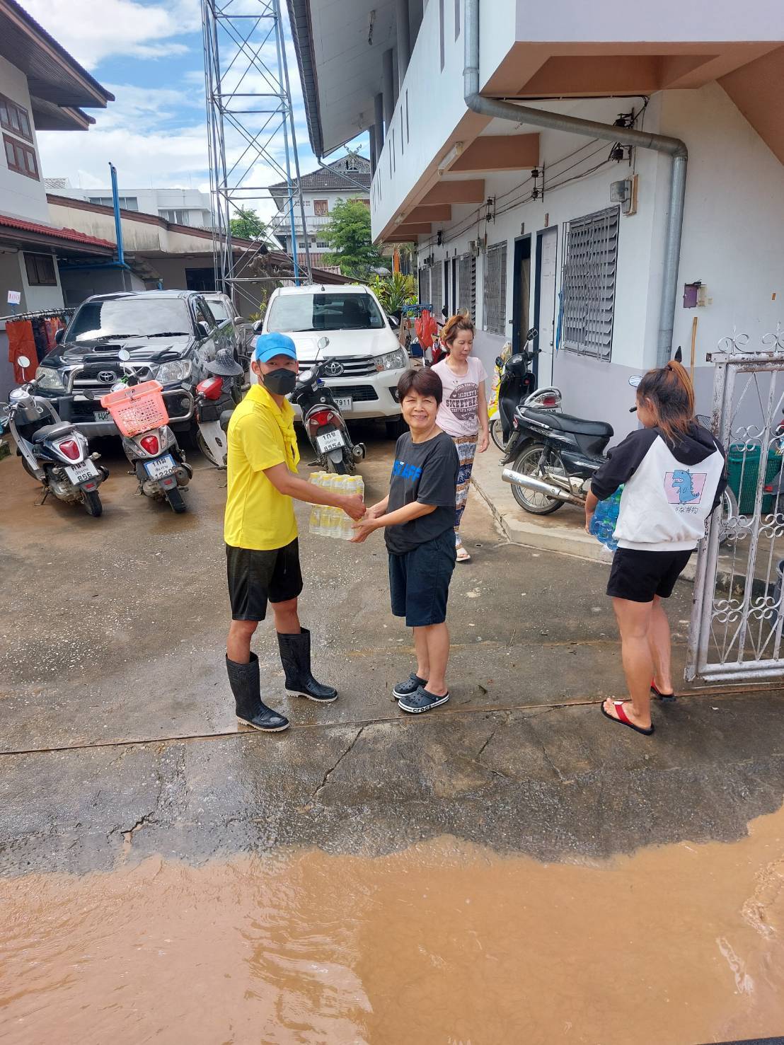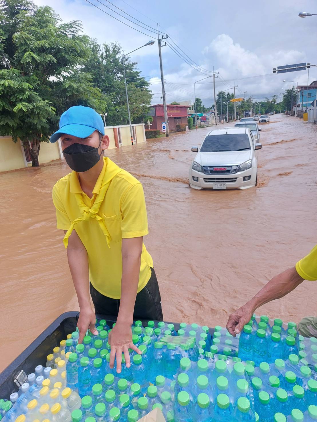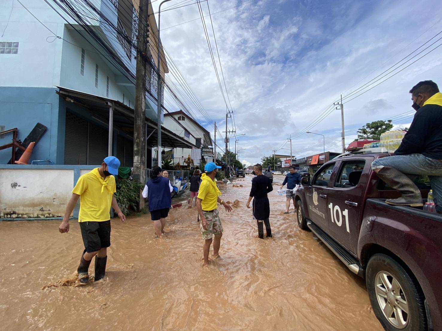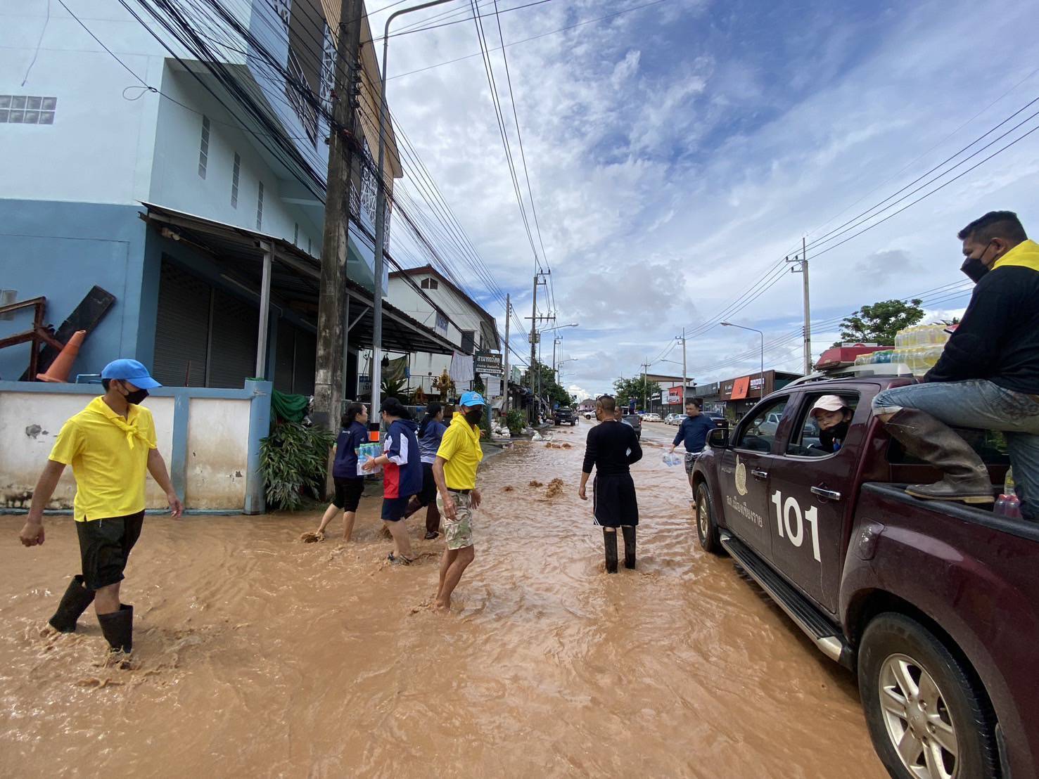 ร.ต.อ.ประกาย หล้าธิ พร้อมเจ้าหน้าที่ประจำจุดตรวจจำบอน พร้อมรถยนต์101 นำน้ำดื่มเพื่อแจกจ่ายผู้ประสบภัยบ้านใหม่ บ้านสักวัน พื้นที่ตำบลริมกกเหตุการณ์ทั่วไปปกติ