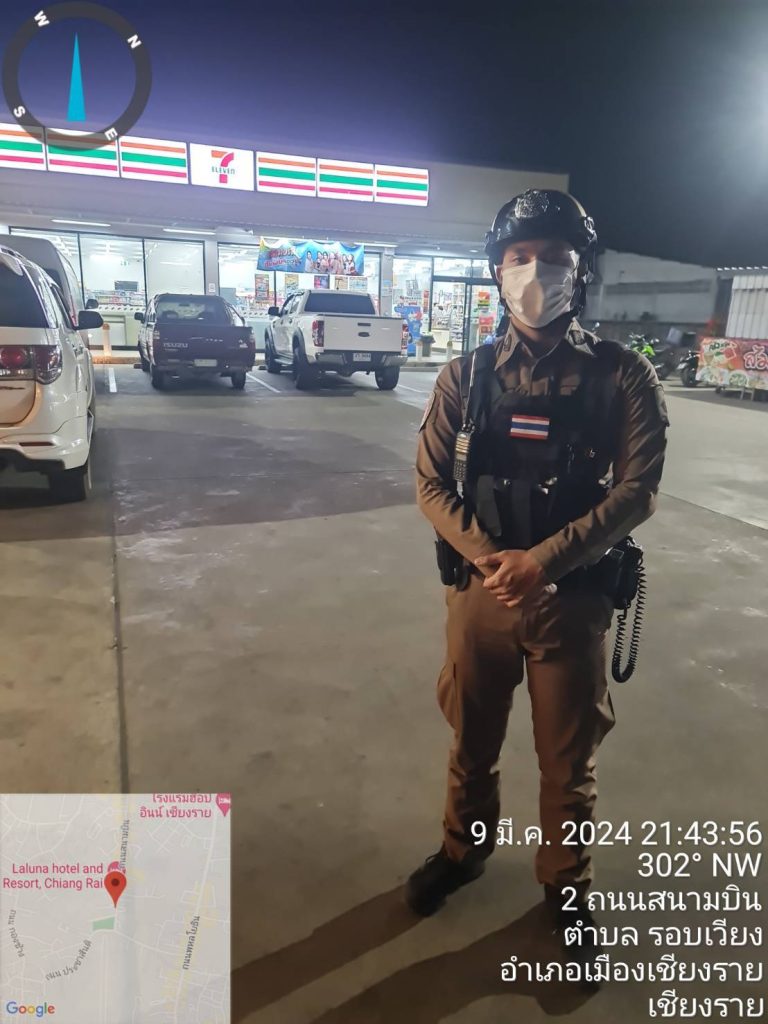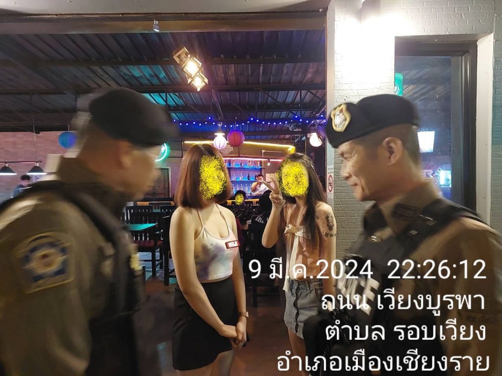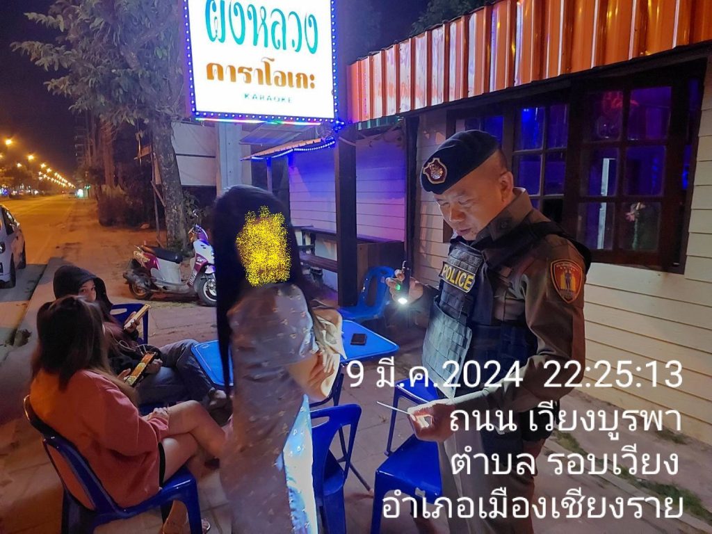 ภายใต้อำนวยการ พ.ต.อ.โสภณ ม่วงเฟื่อง ผกก.สภ.เมืองเชียงราย โดยให้ พ.ต.ท.ฉันทฤทธิ์ เหล่าไพโรจน์จารี รอง ผกก.ป.สภ.เมืองเชียงราย,พ.ต.ท.สถาพร มังคลาด สวป.สภ.เมืองเชียงราย และ พ.ต.ท.สมชาย พรหมมินทร์ สว.สส.ฯได้ปล่อยแถวชุดสายตรวจและชุดสืบสวน ร่วมกับฝ่ายปกครอง ให้ออกตรวจร้านค้า สถานประกอบการที่มีลักษณะคล้ายสถาน บริการ คาราโอเกะและร่วมกันออกตรวจโดยมี ร.ต.ท.สมาน สุภารัตน์ รอง สว(ป.)ฯ ร้อยเวร 20 พร้อมด้วย สายตรวจรถยนตร์ 201 ชุดสายตรวจโยธิน และชุดสืบสวน ว.4 สถานประกอบ ในเขตรับผิดชอบฯ ผลการปฏิบัติไม่พบการกระทำผิดกฎหมายแต่อย่างใด กำชับการให้บริการลูกค้า และปิดตามเวลาที่กำหนด