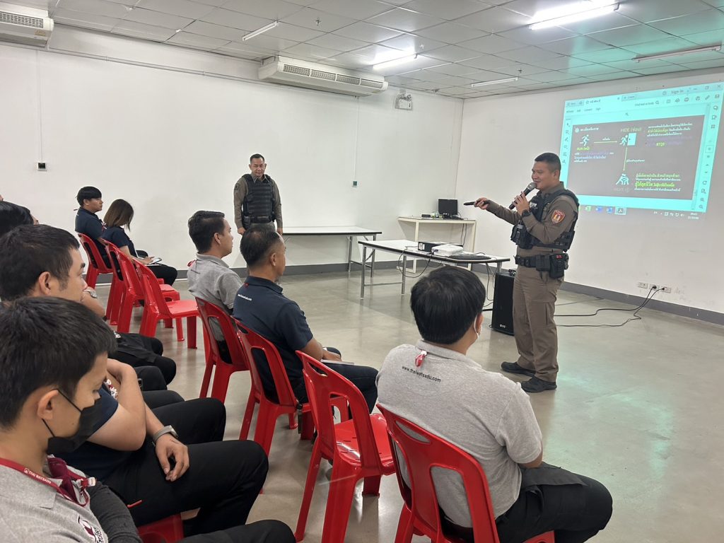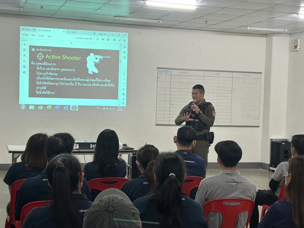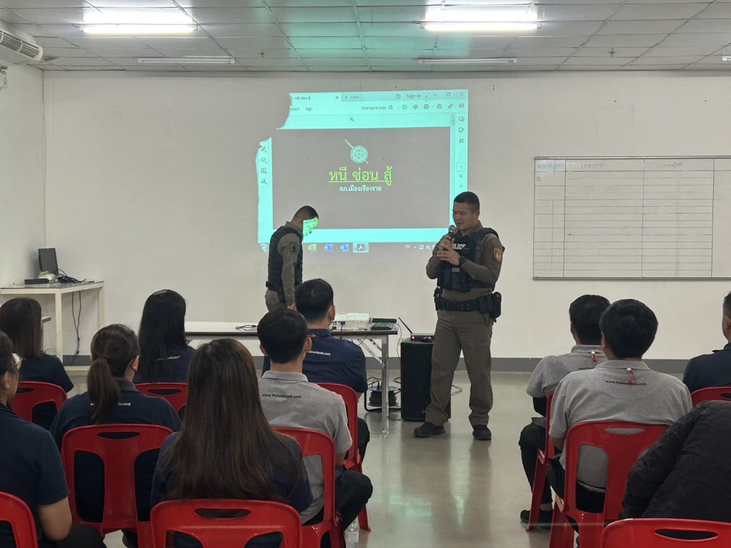 14 พ.ย.66 เวลา 09.00 น.โดยการอำนวยการของ พ.ต.อ.โสภณ ม่วงเฟื่อง ผกก.สภ.เมืองเชียงราย , พ.ต.ท.ภูริวัฒ รุจิรัฐภาส รอง ผกก.ป.สภ.เมืองเชียงราย มอบหมายให้ พ.ต.ท.เอกพล ยาสิทธิ์ สวป.สภ.เมืองเชียงราย เดินทางไปบรรยายให้ความรู้เรื่อง “หนี ซ่อน สู้” ให้กับบริษัทไทวัสดุ สาขาเชียงราย