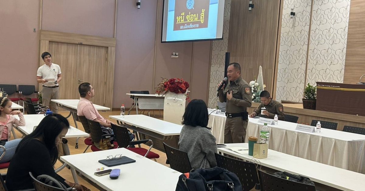วันที่ 8 ก.พ.68 โดยการอำนวยการของ พ.ต.อ.โสภณ ม่วงเฟื่อง ผกก.สภ.เมืองเชียงราย , พ.ต.ท.ฉันทฤทธิ์ เหล่าไพโรจน์จารี รอง.ผกก.ป.สภ.เมืองเชียงราย มอบหมายให้ พ.ต.ต.อิทธิพัทธิ์ ศรีวิชัย สวป.(ชส.)สภ.เมืองเชียงราย พร้อมชุด ชมส. บรรยายเรื่อง หนี ซ่อน สู้ แก่คณะอาจารย์ ม.แม่ฟ้าหลวง ณ ม.แม่ฟ้าหลวง ต.ท่าสุด อ.เมืองเชียงราย จว.เชียงราย