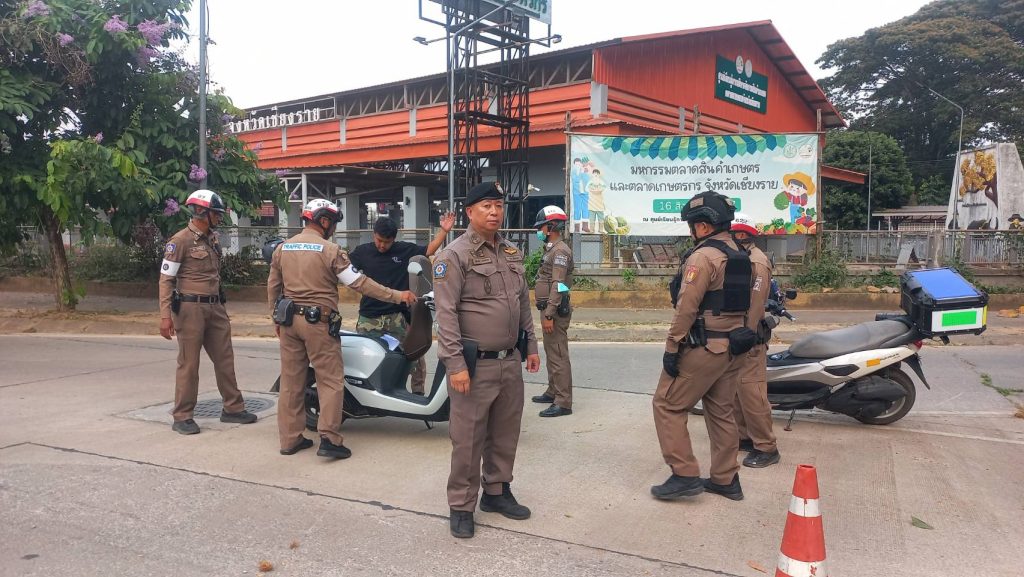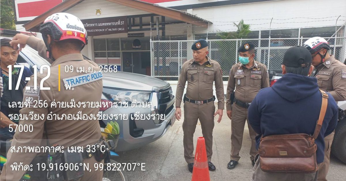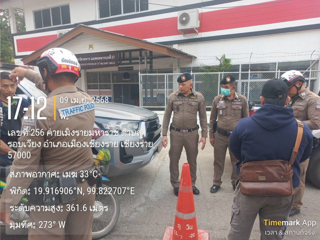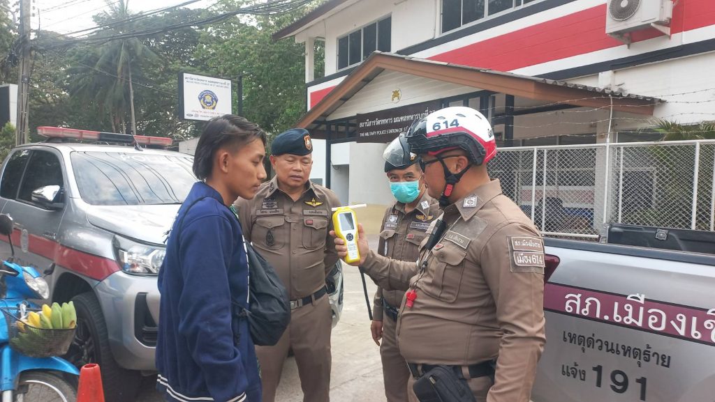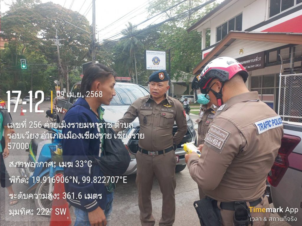 สภ.เมืองเชียงราย วันที่ 9 เมษายน 2568 เวลา 17.00 น. พ.ต.อ.โสภณ ม่วงเฟื่อง ผกก.สภ. เมืองเชียงราย พร้อมด้วย พ.ต.ท พันชาติ สมตัว รอง ผกก. จร.พ.ต.ท. สถาพร มังคลาด สวป พ.ต.ท. สมคิด กันทัด สว.จร.ร้อยเวร 20 และ 60 พร้อมชุด สายตรวจโยธินและชุดจราจร ปล่อยแถวระดมกวาดล้างตั้งจุดตรวจวัดแอลกอฮอล์ รณรงค์เมาไม่ขับและขับรถให้ปลอดภัยในช่วงก่อนวันหยุดสงกรานต์ ปี 2568 แยกร้อย อส. ต.เวียง อ.เมือง จ.เชียงราย 9 เมษายน 2568 โดย admin / ข่าวประชาสัมพันธ์,ข่าวกิจกรรม,ข่าวประชาสัมพันธ์,ข่าวภารกิจผู้บังคับบัญชา,ผลการปฏิบัติงาน,งานจราจร,ผลการปฏิบัติงาน,งานป้องกันปราบปราม FacebookFacebookXXLINELine