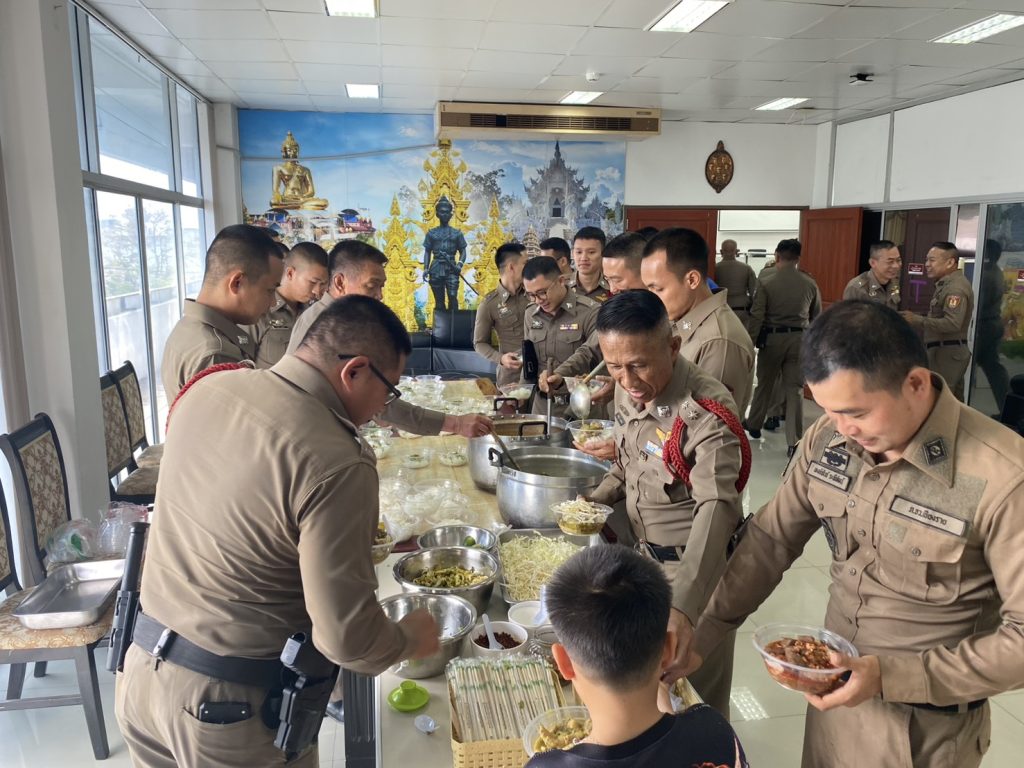 วันนี้ 4 เม.ย.68 เวลา 10.30 น. สภ.เมืองเชียงราย ได้จัดประชุมประจำเดือน ข้าราชการตำรวจในสังกัด สภ.เมืองเชียงราย ณ ห้องประชุม ชั้น 4 สภ.เมืองเชียงราย โดยมี พ.ต.อ.โสภณ ม่วงเฟื่อง ผกก.สภ.เมืองเชียงราย, พ.ต.ท.สาคร ขัตติยะบุตร รอง ผกก.(สอบสวน) สภ.เมืองเชียงราย, พ.ต.ท.เดชาวัต นาทิเลศ รอง ผกก.สส.สภ.เมืองเชียงราย, พ.ต.ท.รัตนพล บั้งเงิน รอง ผกก.(สอบสวน) สภ.เมืองเชียงราย พร้อมด้วย สว., รอง สว. และข้าราชการตำรวจในสังกัด สภ.เมืองเชียงราย เข้าร่วมประชุม ก่อนการประชุม ผกก.สภ.เมืองเชียงราย และข้าราชการตำรวจได้พร้อมใจกันสวดมนต์เพื่อเป็นสิริมงคล จากนั้นได้มีการแนะนำตัวข้าราชการตำรวจระดับ รอง ผกก. – สว.ที่ได้รับการแต่งตั้งโยกย้ายมาดำรงตำแหน่งในสังกัด สภ.เมืองเชียงราย และแนะนำตัว นสต.ที่ได้รับการบรรจุใหม่ ณ สภ.เมืองเชียงราย โดยในการประชุม ผกก.สภ.เมืองเชียงราย และ รอง ผกก.(หน.งาน) ได้ชี้แจงกำชับการปฏิบัติตามข้อสั่งการของ ตร., ภ.5 และ ภ.จว.เชียงราย, ได้เน้นย้ำการปฏิบัติตามเจตนารมย์ต่อต้านการรับสินบน ไม่รับของขวัญหรือของกำนัลทุกชนิดจากการปฏิบัติหน้าที่ หลังจากการประชุม พ.ต.อ.โสภณ ม่วงเฟื่อง ผกก.สภ.เมืองเชียงราย ได้จัดเลี้ยงอาหารกลางวันเพื่อเป็นสวัสดิการและขวัญกำลังใจแก่ข้าราชการตำรวจในสังกัดทุกนาย โดยรายการอาหารเป็นขนมจีนน้ำเงี้ยว และขนมจีนแกงเขียวหวานไก่
