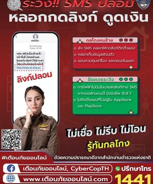 เตือนภัย ระวัง SMS ปลอมหลอกกดเงิน ดูดเงินออกจากบัญชี 26 พฤษภาคม 2566 โดย admin / ข่าวประชาสัมพันธ์,ข่าวประชาสัมพันธ์,ข่าวฝากประชาสัมพันธ์ FacebookFacebookXXLINELine