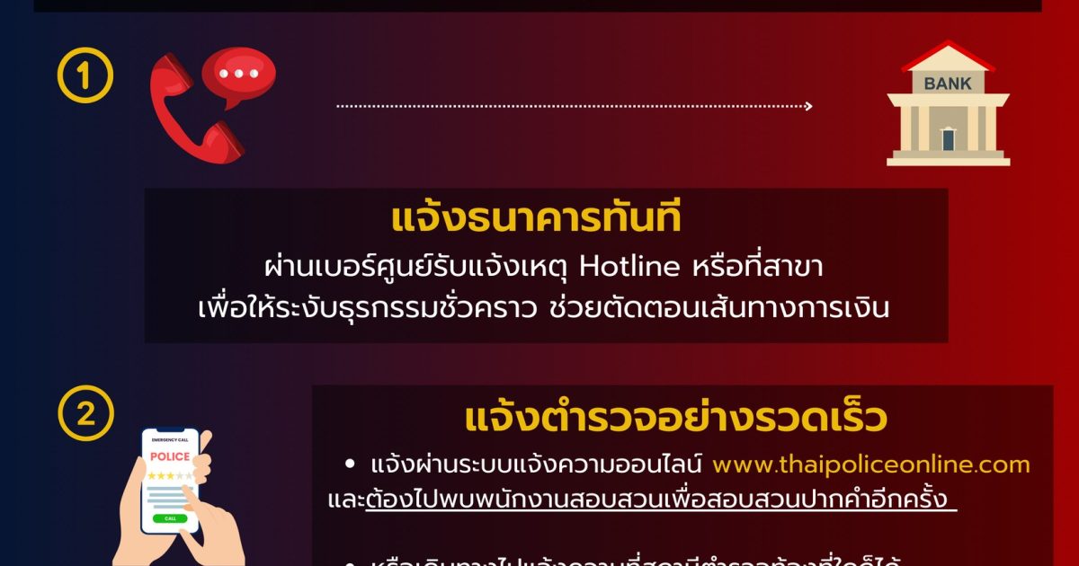 1 – แจ้งธนาคารทันที ผ่านเบอร์ศูนย์รับแจ้งเหตุ Hotline หรือที่สาขาเพื่อให้ระงับธุรกรรมชั่วคราว ช่วยตัดตอนเส้นทางการเงิน