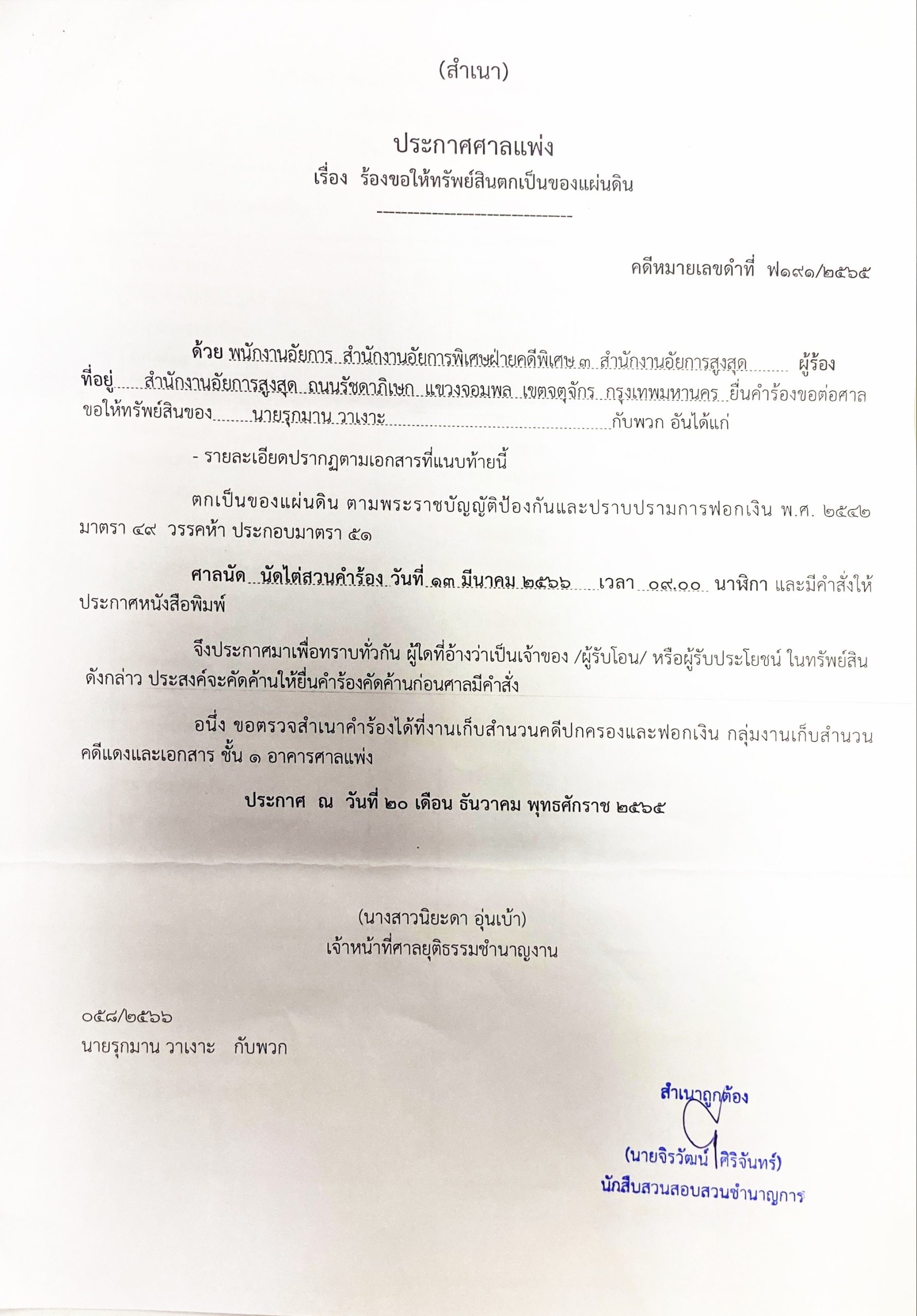 เรื่อง ร้องขอให้ทรัพย์สินตกเป็นของแผ่นดิน
