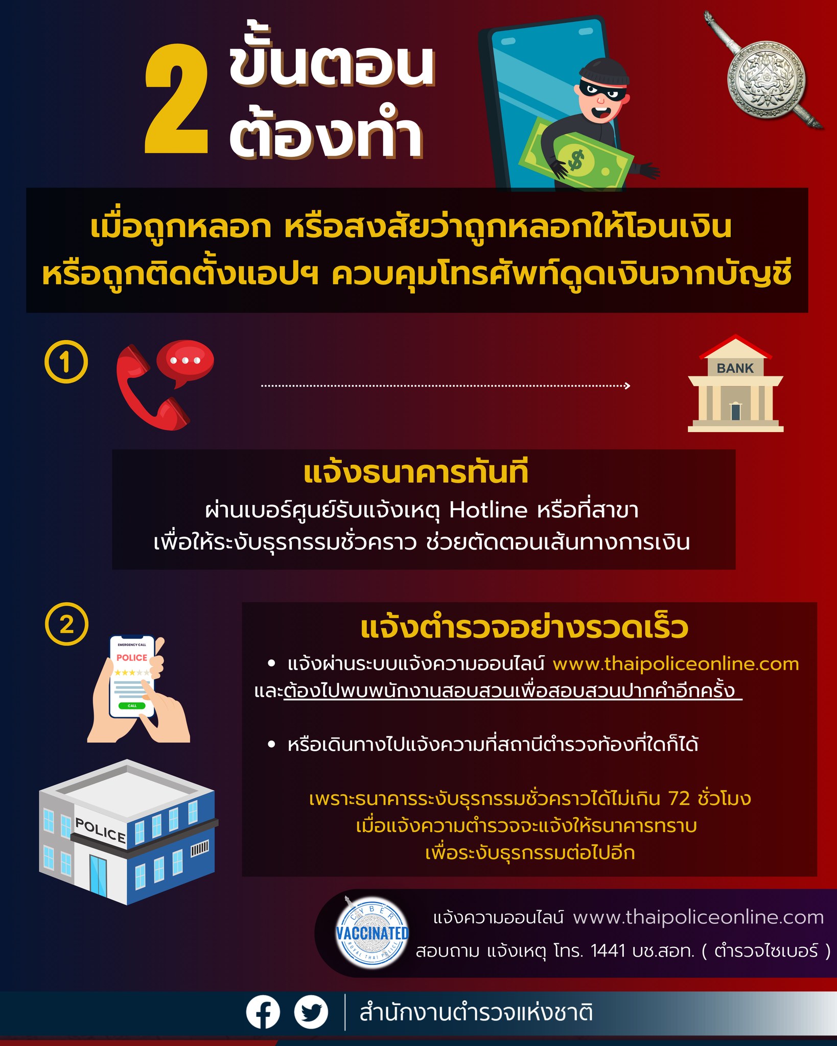 2 ขั้นตอนต้องทำ เมื่อถูกหลอก หรือมีเหตุสงสัยว่าตกเป็นเหยื่อคดีออนไลน์ เช่น กรณีแก๊งคอลเซ็นเตอร์หลอกใ